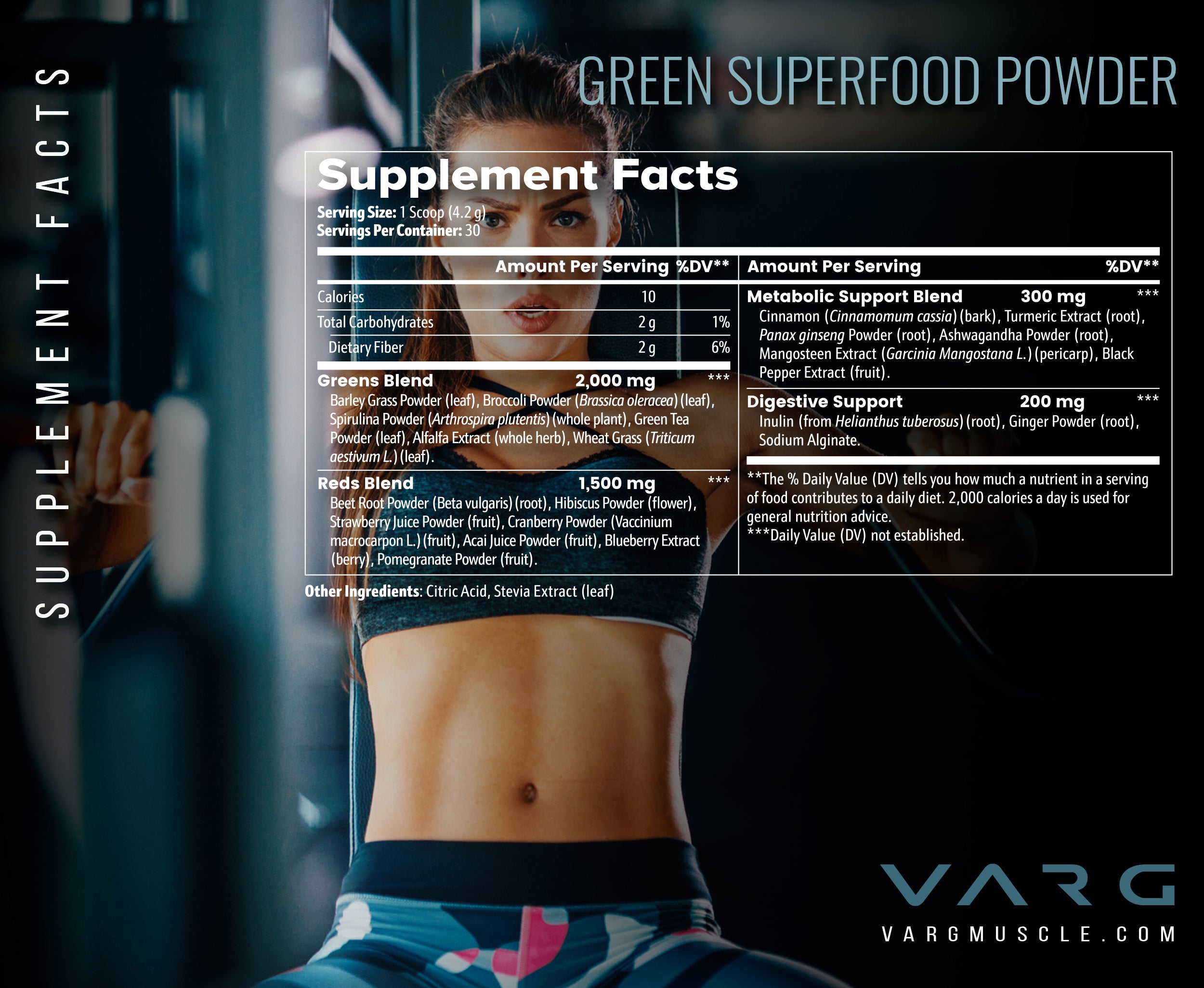 This potent blend combines a wide array of nutrient-rich plant-based ingredients, including Barley Grass Powder, Broccoli Powder, and Spirulina Powder, along with the antioxidant power of Green Tea Powder and Wheat Grass. You’ll also find the vibrant, nutrient-dense Beet Root Powder, Hibiscus Powder, and a variety of superfruits like Strawberry Juice Powder, Cranberry Powder, Acai Juice Powder, Blueberry Extract, and Pomegranate Powder. Adding to this powerhouse are the rich, beneficial roots and extracts of Turmeric, Panax Ginseng, Ashwagandha, and Mangosteen, while Black Pepper Extract and Ginger Powder work synergistically to enhance absorption and support digestion. Finally, Inulin, derived from the root of the Helianthus tuberosus, and Sodium Alginate round out this formula, offering a full spectrum of nutrients to promote overall health and wellness.
